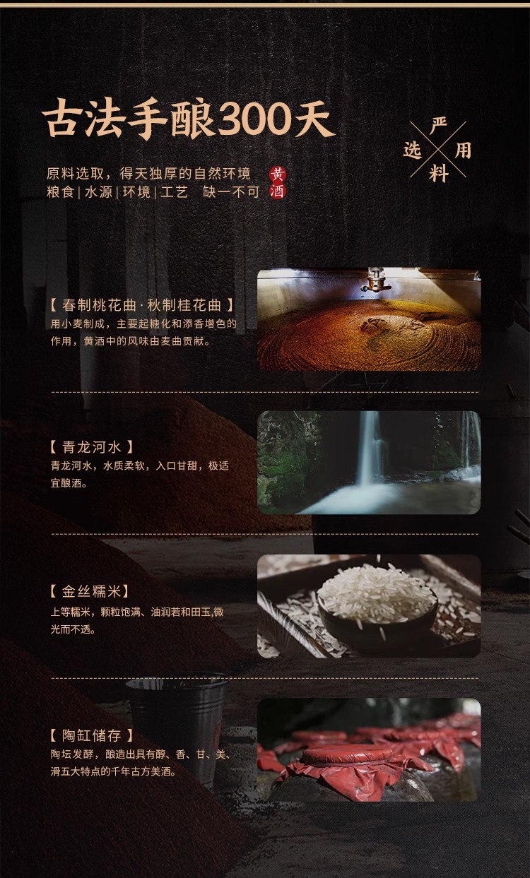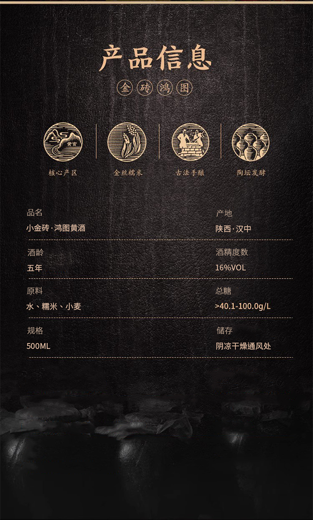 ★国粹酿系列:黄官金砖·鸿图16度、黄官金砖·远黛17度、黄官金砖·汉粹18.5度场景:宴/礼;容量:500ml;酒精度:15%Vol-18.5Vol;窖藏:5-10年;气味:果香、木香、米香、自然和谐;色泽:天然澄澈,色如琥珀,无添加焦糖色;口感:醇,香,甘,美,滑,米、果、木质味交织;原料:五常糯米,青龙泉水;工艺:非物质文化遗产传统技艺,古法手酿300天。...